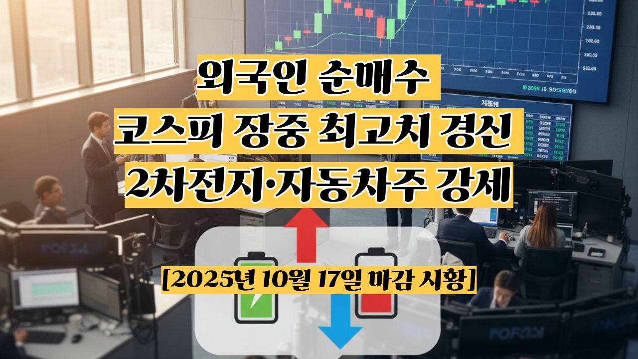 [2025년 10월 17일 마감 시황] 외국인 순매수에 코스피 장중 최고치 경신, 2차전지·자동차주 강세