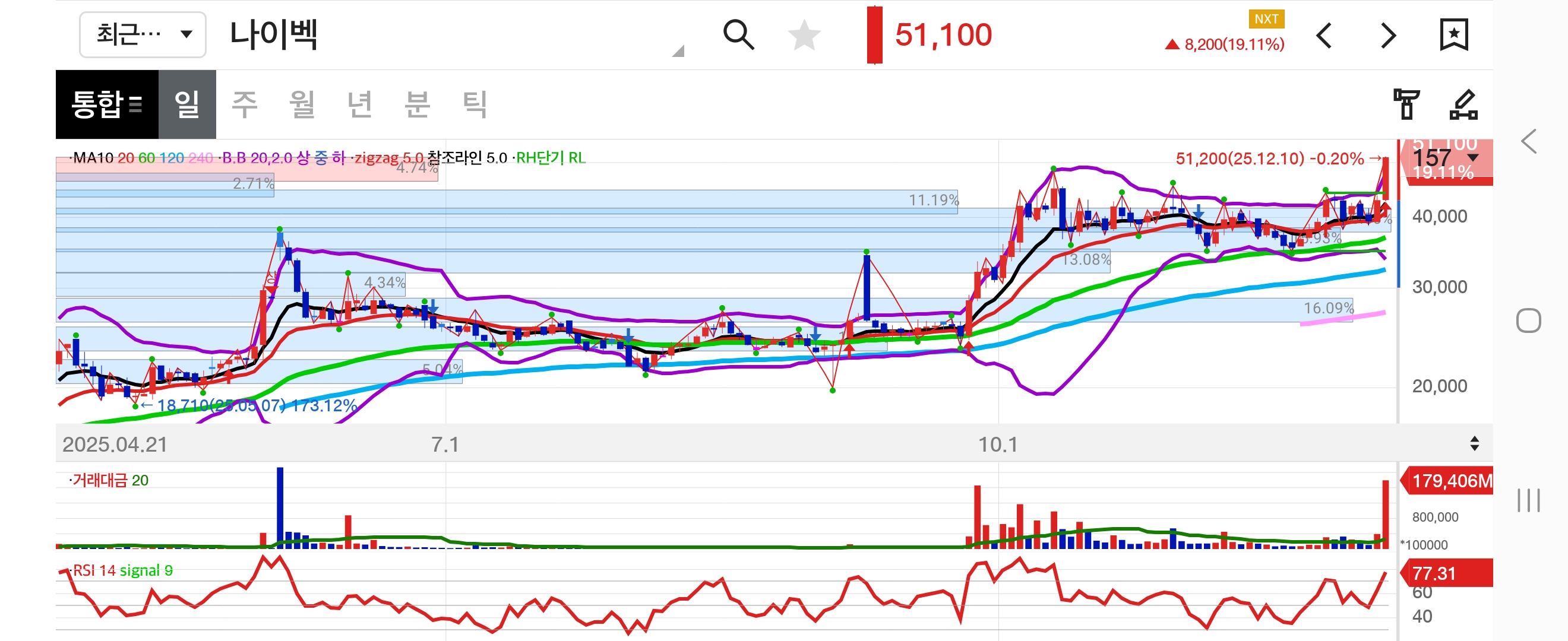 - 지표 분석: RSI(상대강도지수)가 77.31로 과매수 구간에 진입했습니다. 통상적으로 과매수 구간은 조정의 신호일 수 있으나, 거래량이 폭발하며 신고가를 갱신하는 초입에서는 **'강력한 모멘텀'**으로 해석해야 합니다. 주가가 볼린저 밴드 상단을 강하게 뚫고 올라가는 형태입니다.