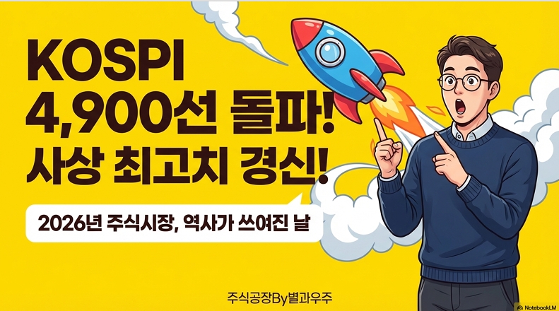 "KOSPI 4,900선 돌파하며 사상 최고치 경신, '피지컬 AI(Physical AI)'와 '친환경 모빌리티' 정책 모멘텀이 지수를 견인한 역사적인 하루."