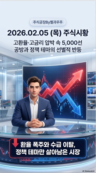2026년 2월 5일 대한민국 증시는 외환 시장의 변동성 확대와 외국인 및 기관의 동반 투매로 인해 매우 불안정한 흐름을 보였음. 특히 코스피 시장은 심리적 지지선인 5,000선을 두고 치열한 공방을 벌였으나, 장 후반으로 갈수록 매도 압력이 가중되며 큰 폭의 하락세를 기록했음. 이는 지난 2026년 2월 2일 발생했던 소위 '검은 월요일'의 충격이 완전히 가시지 않은 상태에서, 원·달러 환율이 급등하며 투자 심리를 극도로 위축시킨 결과로 분석됨.