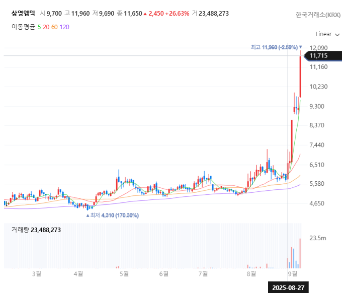 - 기술적 분석: 강력한 거래량을 동반한 장대 양봉으로 52주 신고가를 경신하며 매우 강한 상승 추세에 진입했습니다. 단기 급등에 따른 변동성 확대는 유의해야 합니다.