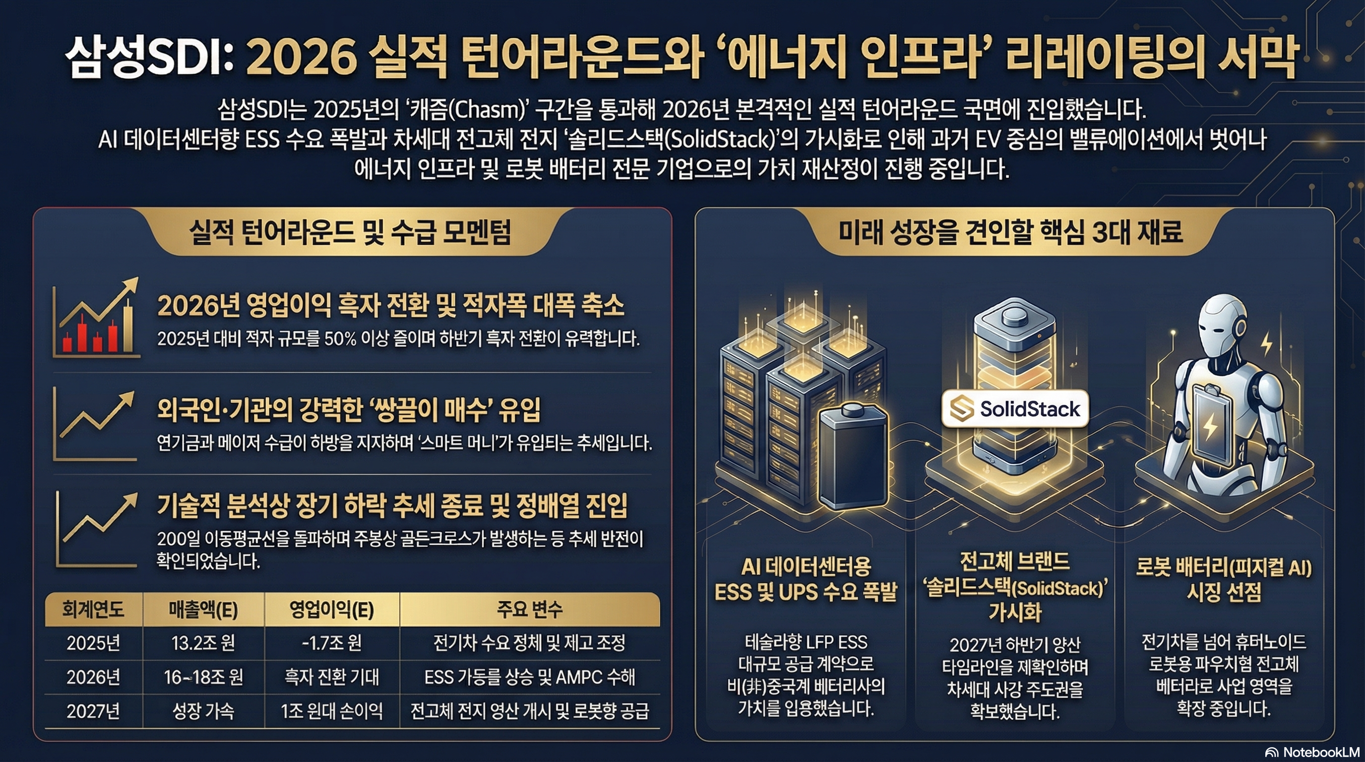 - 삼성SDI의 재무 상태는 2025년 일시적 적자 국면을 지나 2026년 뚜렷한 턴어라운드를 예고하고 있다.