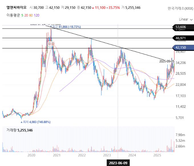 | 오늘 시황 | 42,150원 (▲ 29.89%, 상한가), 거래량 폭증, 52주 신고가 경신 |