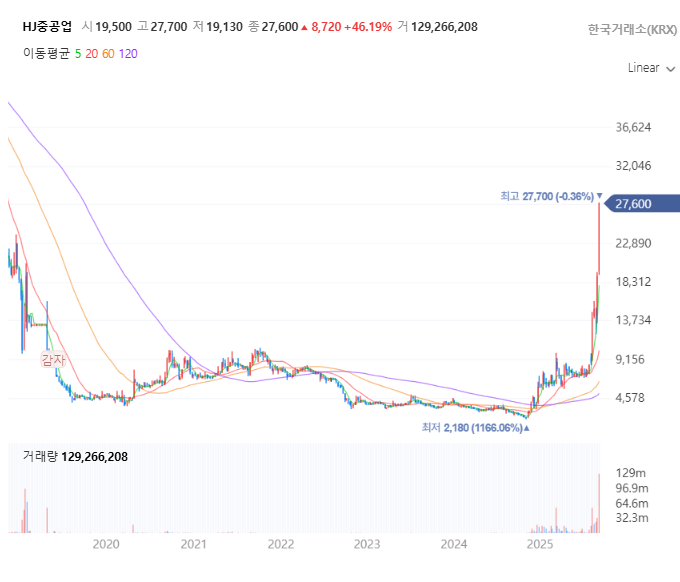 | 기술적 분석 | HJ중공업과 유사한 정배열 신고가 패턴. 상승 N자 파동을 그리며 꾸준히 우상향. 5일 이동평균선이 강력한 지지선으로 작용. |